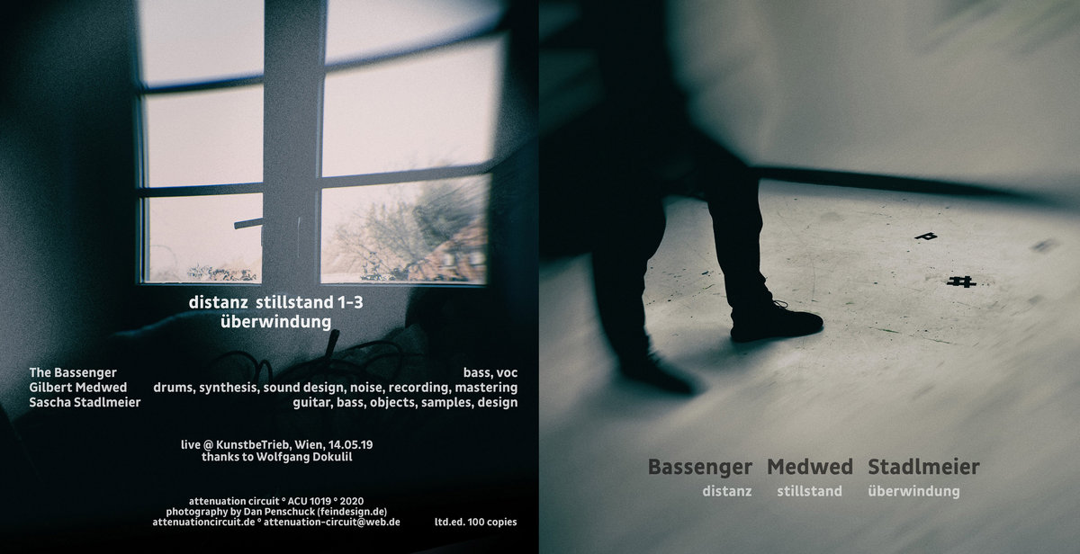 When not working on releases as EMERGE for his Attenuation Circuit label, Sascha Stadlmeier can be found on many stages across Europe. Playing solo, again as EMERGE, or in various ad hoc combinations. On May 14 last year, he was at KunstbeTrieb in Vienna and playing the guitar, bass, objects and samples, along with The Bassenger (also known as Julia Zemanek; bass and vocals) and Gilbert Medwed (drums, synthesis, sound design and noise). The title can be translated as 'distance stagnation overcoming' and they played for some forty eight minutes and the result can be found on this release. This is surely a strange release, even for Stadlmeier. He's a more than an occasional member of Doc Wör Mirran and they play a sort of krautrock; this trio is also rocking; in a very peculiar way. The music is throughout improvised and very spacious. Sometimes it unfolds into a steady rock rhythm but just easily it meanders about for some time. There is sometimes spoken word, of which the meaning eludes me, yet reminded me of the first two Kluster records (of which the religious connotations also went past by me when I first heard them). The press text says it along with the best work of Einsturzende Neubauten; so, it is surely somewhere in the middle, I think. It took me a couple of rounds to enjoy this. At first, I thought it was just a bunch of free improvised music but the more I heard the more sense it made and I started to recognize patterns and underlying ideas and with every round, I enjoyed it more. Certainly, this is an oddball in his catalogue, but for anyone who follows the career of Stadlmeier certainly one to check out.