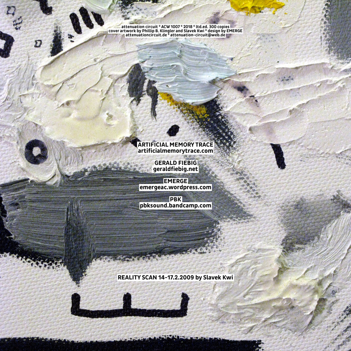 All of the artists on this album share a love of creating electroacoustic music from field recordings or found sounds. Therefore, label manager Stadlmeier invited Artificial Memory Trace (AMT) and PBK to supply source sounds from their archives. These were then used as the basis for the compositions. Leaving the source material identifiable was not the task – it was to be used as raw material to be sculpted, very much in the spirit of acousmatic musique concrète. On the AMT side, we find the tracks by PBK and Gerald Fiebig. They both used AMT's source material to create their tracks. PBK delivers a dense, rather rhythmic track with a decidedly “industrial” feel. Fiebig's track, on the contrary, uses the front cover artwork – a digital collage by EMERGE of visual works by Kwi and Klingler, with other works by them reproduced on the lavishly printed LP insert – as a graphic score for realising a rather harmonic ambient piece. On the PBK side, Artificial Memory Trace and EMERGE “play” the source sounds supplied by PBK. The piece by Artificial Memory Trace qualifies as exuberant rhythm noise, while EMERGE goes all the way into rather meditative laminar lower-case drone minimalism. Therefore, regardless of which side of the record one plays first (“AMT” and “PBK” are engraved on the vinyl itself to guide the listener), one will experience, thoroughout the whole album, a change between very different sonic textures and temperaments that showcase the wide range of expressive possibilities of electroacoustic music. This is not the product of good luck, but of planned collective composition: AMT and PBK, as the “guests” on the label, were invited to create whatever they liked without any formal restrictions. As it turned out, both of their works were rather intense and direct in character. Therefore, EMERGE and Fiebig both made an effort to complement each side with a more subdued, quiet piece.