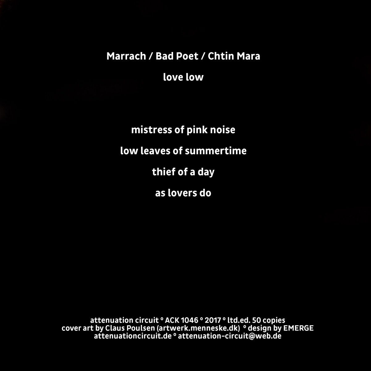 Love Low (ACK 1046, CD-R) setzt mit monoton gemurmelter Lyrik ein, elektronisch umgrollt, umknarzt, mit melancholischem Baritonsaxophon, aneckendem Drumming, Handclappingbeat. In MARRACH / CHTIN MARA erkennen wir den Litauer Martin Rach und zusammen mit BAD POET das Dreamteam von "Opus Oratorium" (2016), das sich durch Varese'sche Arkana und Mountains of Madness gegraben hat. HipHop, NoirJazz und Illbient verschlungen zu 'Tripstep'. The Last Poets meet Death Grips auf Valium ...but when you speak of love, / speak low... i body sense the silence / you left without a sound / i cover up with moss / wary of being found... Swing lower, swing slower, sweet - ? Bad poets of all times / have called it 'heart'.