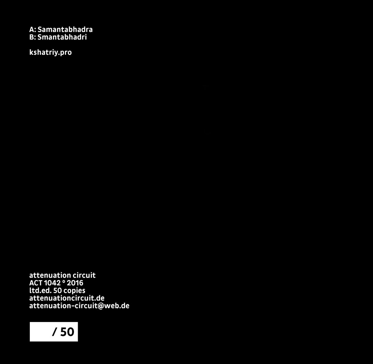 The first part of this release, "Samantabhadra", starts as a something between a drone and a loop as the resonances of the drone periodically emerge as in a loop and develops quietly letting all sounds unfold without any contrast but using this predictability as a mean to let the listener concentrate on sound, so even when it starts a sort of noisy deviation from this path after a while it's stopped to let the track end in an almost perfect circle with the start. The second part, "Samantabhadri", uses a small metallic beat as the centre of the track as all sounds revolves around this beat so a sense of time passing became the focus of the track until this beat stops and this release ends in silence.