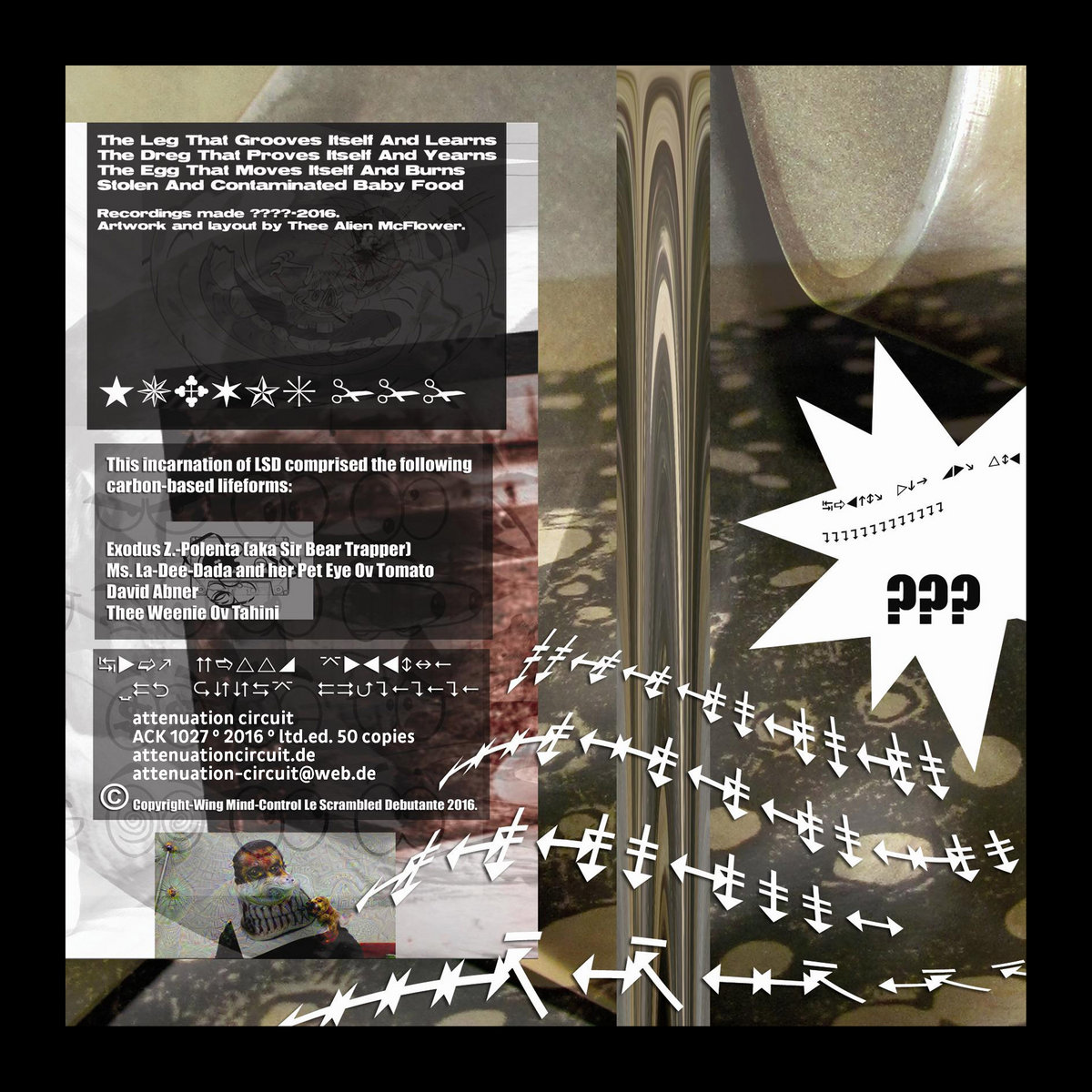 Le Scrambled Debutante is by now a group who is a firm fixture in the ranks of Attenuation Circuit and this time around consists of Exodus Z. Polenta (aka Sir Bear Trapper), Ms. La-Dee-Dada & Her Pet Eye Ov Tomato, David Abner and Thee Weenie Ov Tahini; surely there are some pseudonyms in there, I'd say. The previous review I wrote (in Vital Weekly 1047) is listed on the bandcamp page with this release and perhaps that has to do with the constant flow of releases in Circuit land, but maybe we are to believe that some of this is also a bit interchangeable? It is an impression that at least stuck with me. Le Scrambled Debutante is one of those 'bands', 'projects' if you will, which release quite a bit of music, and one doesn't have a proper clue as to how it was created, so one has to guess; when a lot of music sounds quite the same, and perhaps that previous already explained it all: "I have this vaguely romantic notion that they gather around a reel-to-reel tape machine and consume the right kind of spiritualia and do this all group musical weirdness using electronics, records, and what have you. As such this new work isn't much different than many of the other works I heard from LSD; there is a serious pile-up of sound debris on their machines (analogue or otherwise) and someone is blindfolded when doing the mix of this, moving through the various sections they recorded, but stays all one piece of music. Some of these sections are a bit long I would think and some rigorous editing could be in place to make it all a bit more surrealist and/or Nurse With Wound (take your pick), but my suggestion is to use a similar amount of psychotropia and bob's y'r uncle." In that sense this one is more of the same thing; still no bottles are open here, or joints are rolled, so perhaps it all sinks in a bit later?