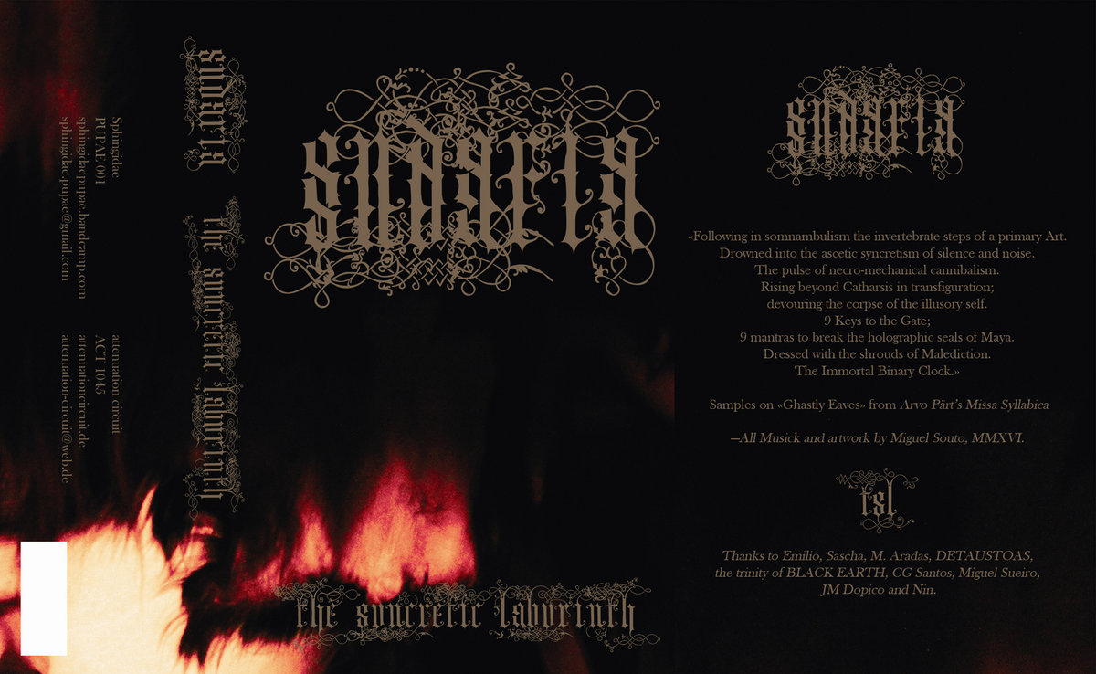 The Syncretic Labyrinth is a dark, contemplative and often hellish joint release from the German Attenuation Circuit and Spanish Sphingidae labels. Ghostly winds and strained, shrieking guitars set the tone on opening track Veils of the Syncretic Maya before a low drone edges in, paving the way for a frightening chugging as if feral pistons were rampaging through rain-drizzled streets. Kapala then pours its gloopy way into the skull of its audience. A thick, blackened bass rumble squeezes into your cranial space as unrelenting, reverb-chained, metallic thuds pound out in the approaching distance. Voices gasp in reverse like a solemn message escaping from the Black Lodge before being replaced by a pained guitar painting the aural landscape. This shifts from solitary notes to driving chords, whipping up a growing sense of tireless toiling – the slog of existence peppered with a glimmering light through wretched gloom.