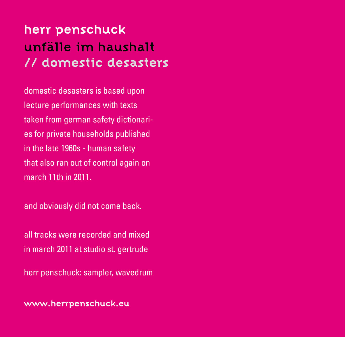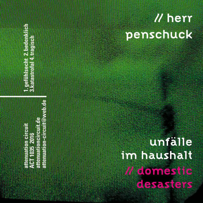 Herr Penscchuck plays sampler and wavedrum on his 'Unfälle Im Haushalt/Domestic Desasters' and that is not my mistake (this time) but it says so on the cover. I read on the cover that this is 'based upon lecture performances with texts taken from German safety dictionaries for private households published in the late 1960s - human safety that also ran out of control again on march 11th in 2011.' I was thinking of Die Tödliche Doris who had a 7" with more or less the same title, but there is no relation I think. Throughout we hear crackles of what could come from an old record, or an Ableton Live plug in, and on top of that Penschuck plays a string instrument in 'Gefühlsecht', a bit of synth and what could be a clock in 'Bedenklich'. In 'Katastrofal' everything goes down the sewer, with lots of low-end sound, a rumble, a rainstorm or a cart down the street. The final piece is a 'song', with voices and sounds that are hard to define. It all sounded to me like a 80s home taper release, which is of course isn't a bad thing, but it also didn't blow me away either.